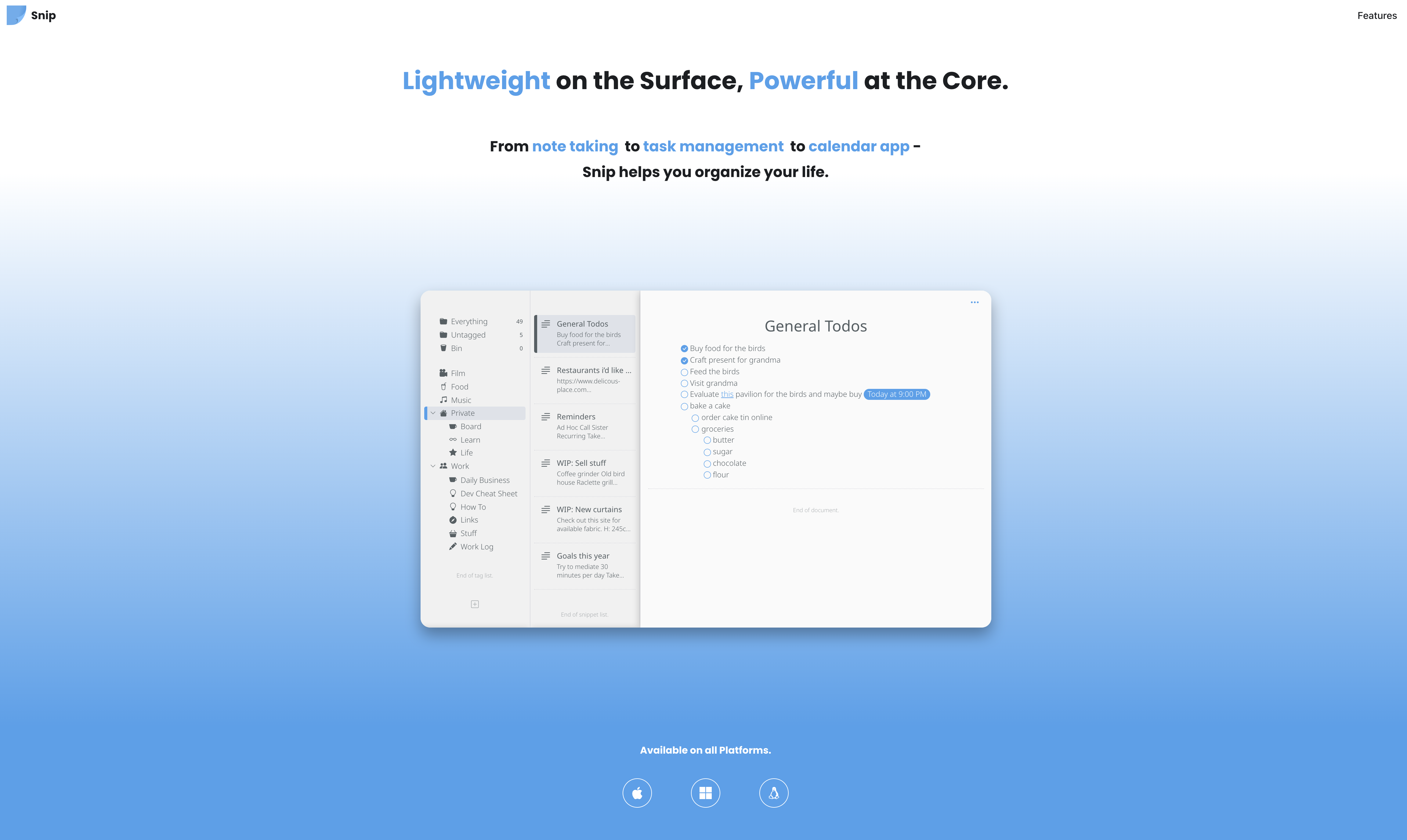 Lightweight on the surface, powerful at the core. From note taking to task management to calendar app – Snip helps…